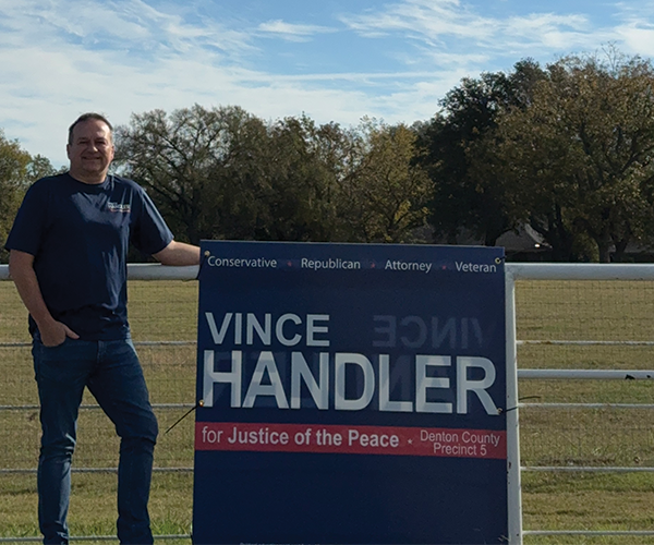 "I've known Vince Handler for a few years... When he became a precinct chair in my area, he proved himself to be hardworking and helpful to other precinct chairs. He became involved with the Denton County GOP as a whole focusing on doing what our job is - that is to get Republicans elected. He is now actively following DCRP procedures, bylaws, and rules as a good judge would to help make things go smoothly and by the book." - Cross Roads Precinct Chair Dr. Scott Lipscomb, DDS